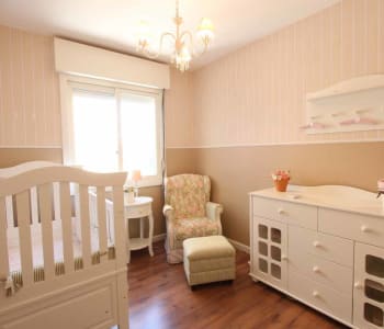 Kies ook hier voor een makkelijk afwasbare ondergrond, zo bespaar je jezelf een hoop werk. Een kortharig kamerbreed tapijt of een soepele vinyl is ideaal. Wil je niet gewekt worden door de kreetjes van je baby bij de allereerste zonnestralen, zorg dan voor gordijnen die het licht voldoende tegenhouden. Sowieso houdt je kleintje niet van direct of te fel zonlicht: je voorziet dus beter zachte diffuse lampen aan de muur, lampenkappen en verdraaibare spots.