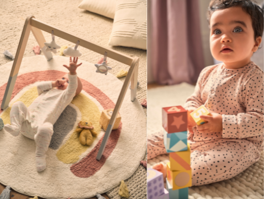 Kies zoveel mogelijk voor speelgoed met verschillende texturen en vormen zodat je kindje al spelend de wereld kan verkennen. Houten legpuzzels, houten of stoffen blokken en knuffels vind je in bijna alle kleuren zodat er zeker iets bij je babykamer past.