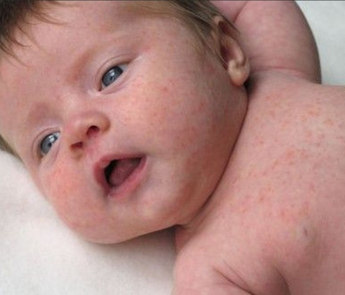 - Rode uitslag, eerst in de plooien van de ellebogen en knieën, die zich vervolgens kan uitbreiden naar de romp, het gezicht (behalve rond de mond), armen (behalve de handpalmen) en benen (behalve de voetzolen).