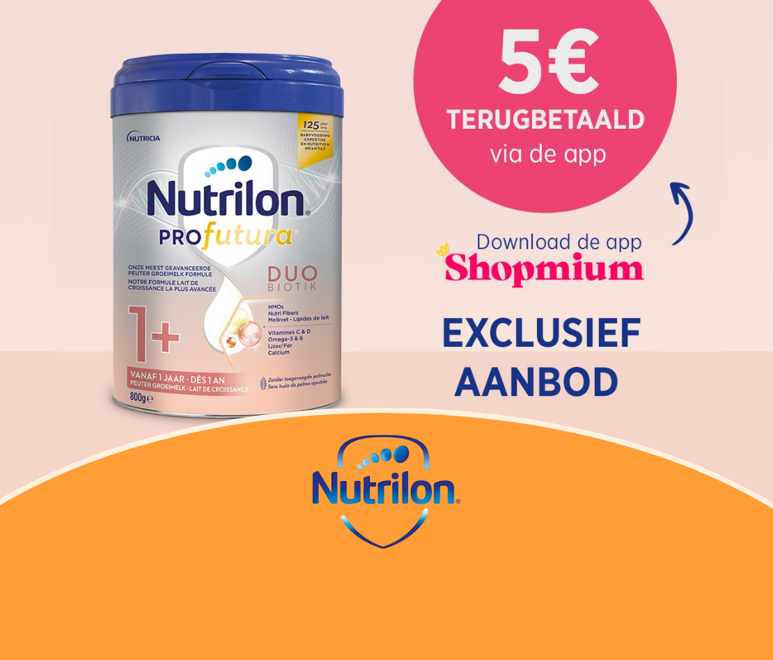 Bij de aankoop van 1 doos Nutrilon® Profutura 1+ Peuter Groeimelk uitsluitend beschikbaar in de apotheek.