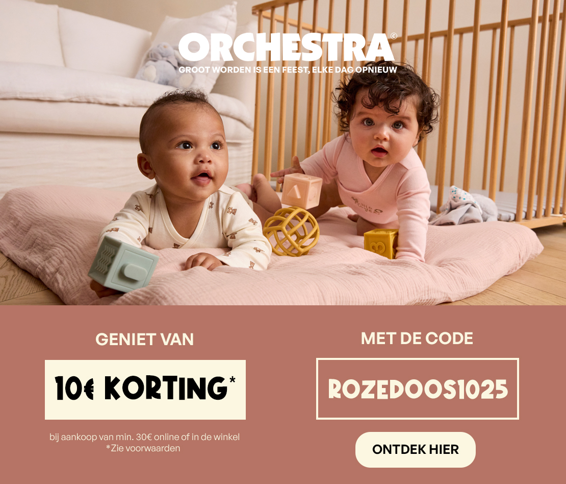 Aanbieding geldig in de winkel en op orchestra.com met de code ROZEDOOS1025. Onmiddellijke korting van €10 bij elke nieuwe Club-lidmaatschap voor een minimumaankoop van €30.